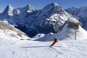 グリンデルワルトの隣のラウターブルンネン谷奥のミューレン&シルトホルンスキーエリアへ。 スキーパスはユングフラウエリアの…