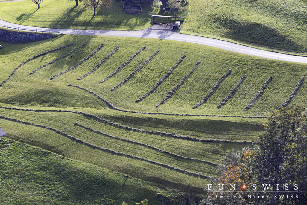 眼下には牧草をまとめる農家の人々
