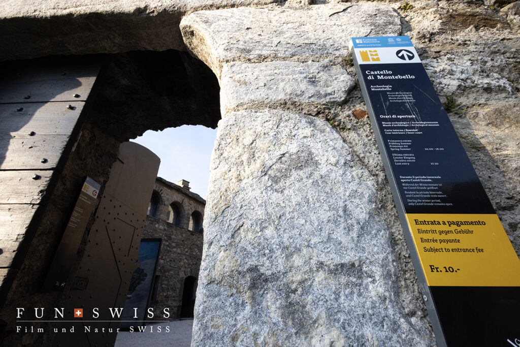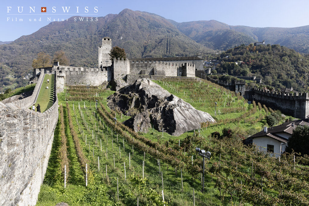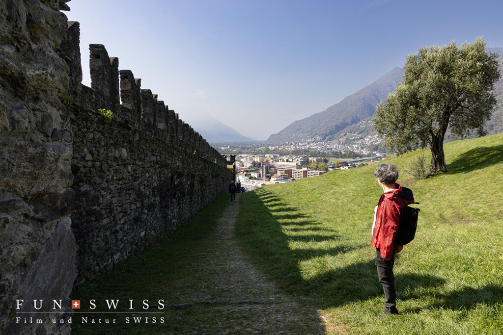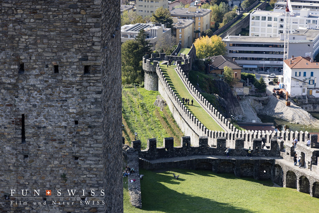 その街中に、カステルグランデ、カステッロ・ディ・モンテベッロ、カステッロ・ディ・サッソ・コルバーロの三つの古城と、街を取り囲むように残されている城壁が現在に残る中世アルプスの要塞都市モデルとして高く評価され、2000年にユネスコ世界遺産に認定されました。