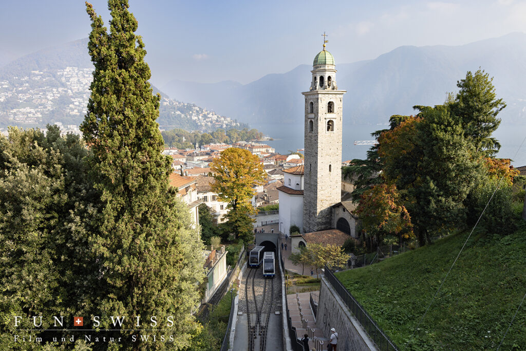 坂の街、ルガーノ。高台にある駅は、湖近くまでケーブルカーで結ばれています。