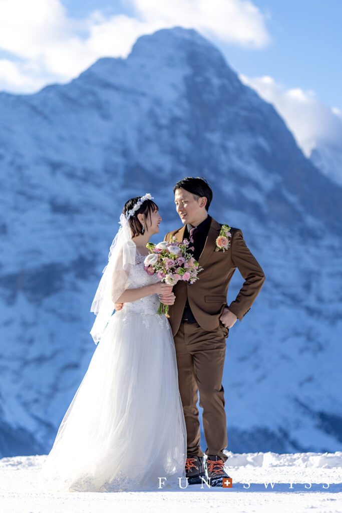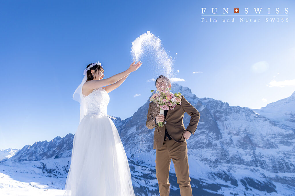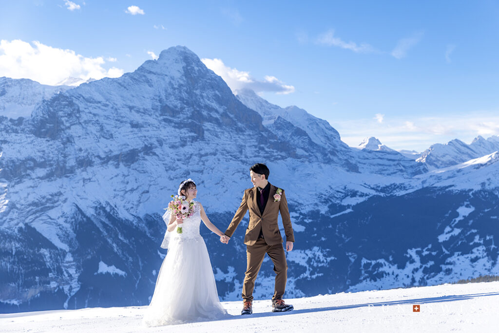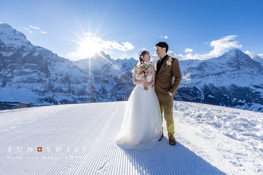 スイスアルプスの眩しい白銀世界でウェディングフォト