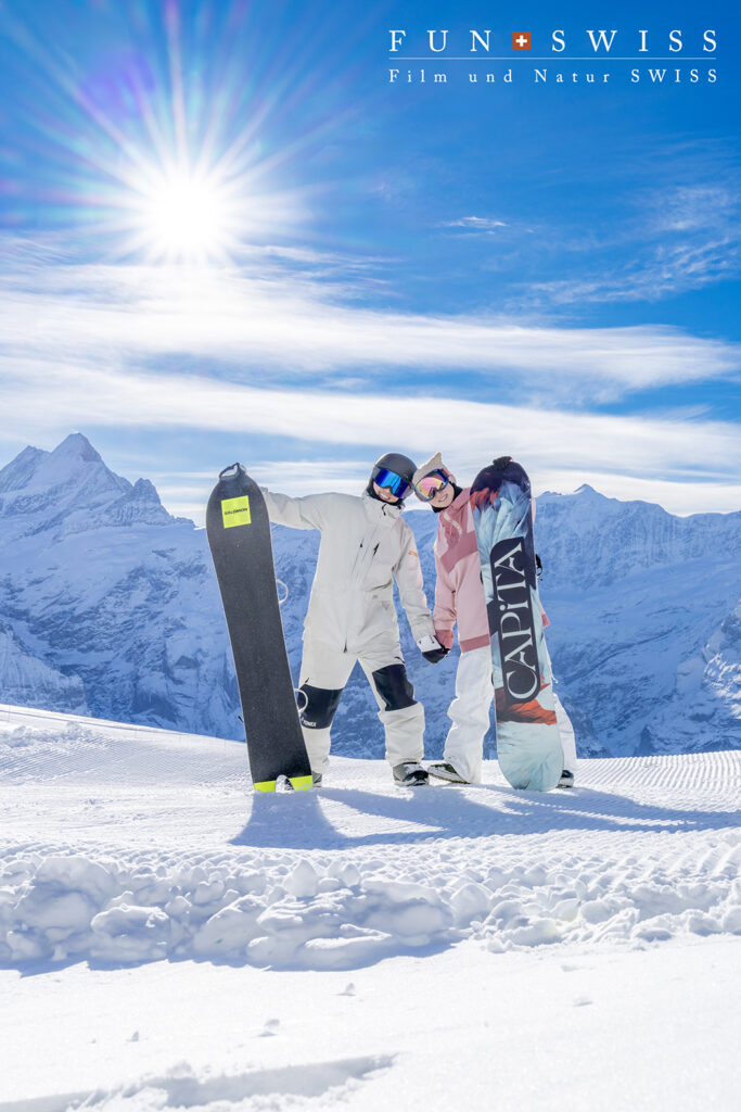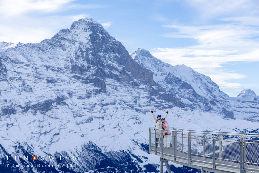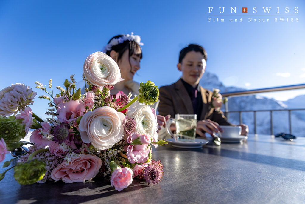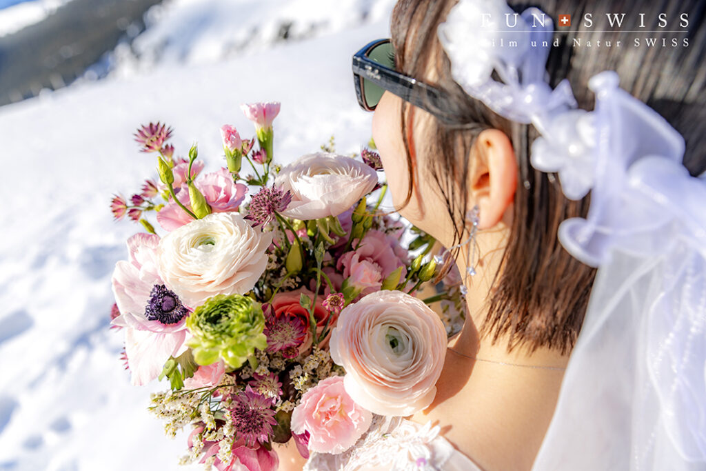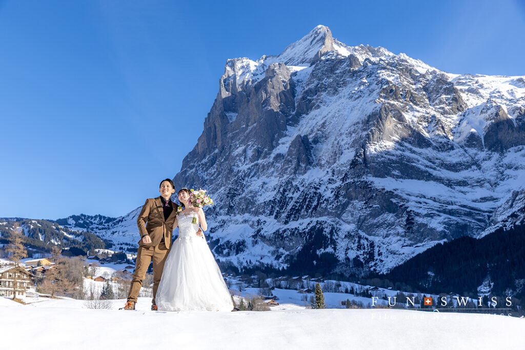 スイスアルプスの眩しい白銀世界でウェディングフォト